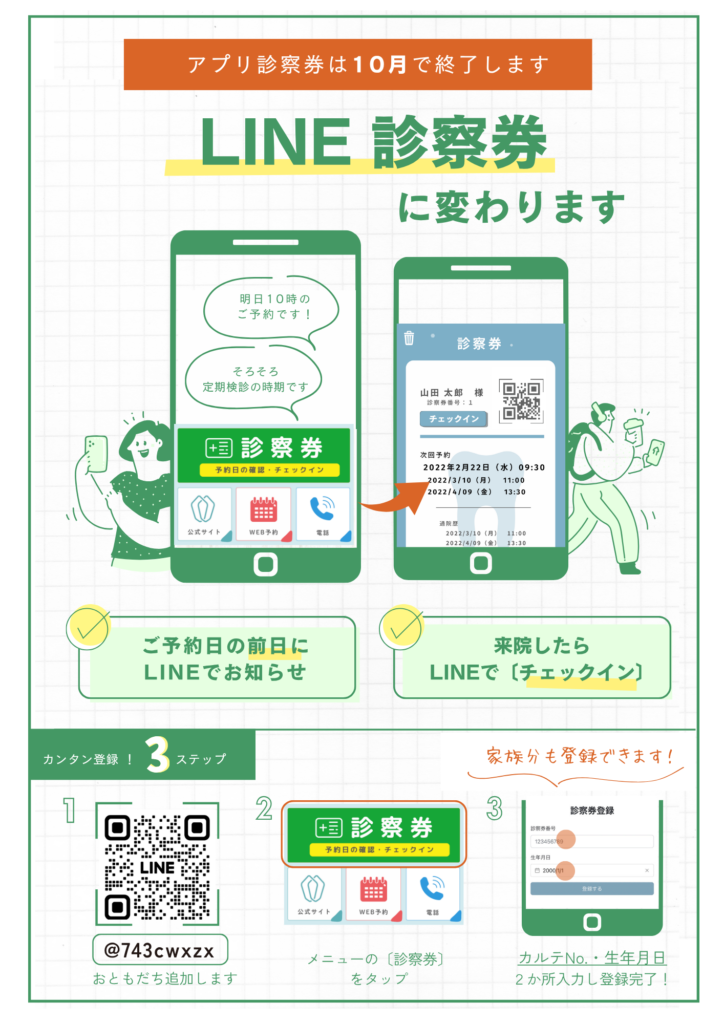 今まで使用していた診察券アプリを10/28 で廃止し、10/29 13:30よりLINE診察券に完全移行いたします。いつも利用している【LINEアプリ】が診察券代わりとなり、いつでも予約を取得・確認できるようになる他、ログインするだけであらかじめ“次回の予定・診察内容”を自動的に反映できる仕組みになり、次回予約取得時のストレスが軽減されると予想しています。